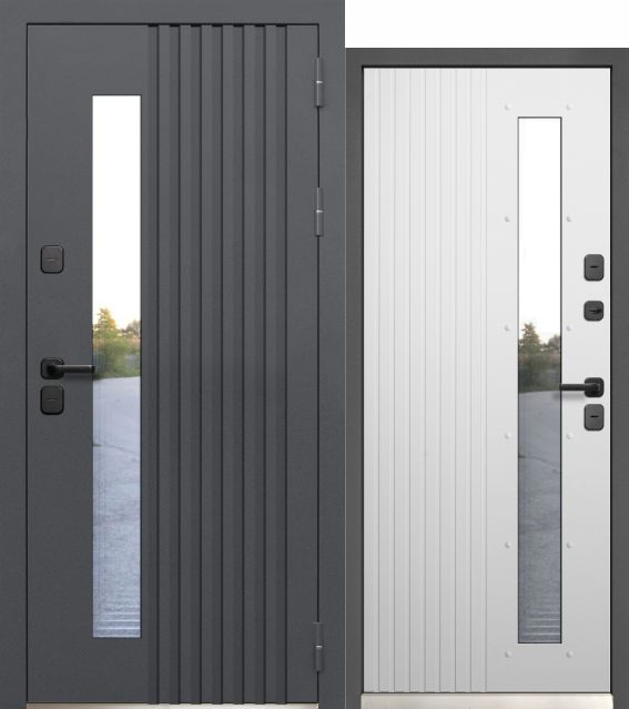 Внешнее покрытие: атмосферостойкое порошково-полимерное «Муар 7024». Металлические рейки на полотне Внутреннее покрытие: фрезерованная МДФ-панель 10 мм, цвет пленки «Эмалит белый» Стеклопакет: 4 камеры, 96 мм, тонированный «Серебро» Толщина дверного полотна/короба: 110 мм / 137 мм