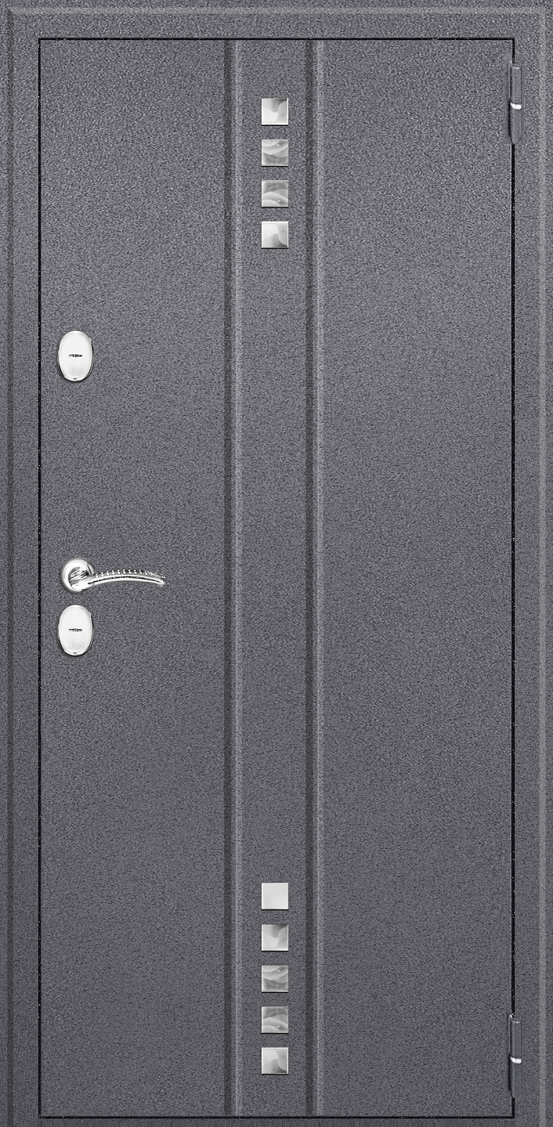 Порошково-полимерная покрытие "Букле черный", 2 волны с перфорацией и хромированными вставками в виде квадратов. Наличник с перегибом